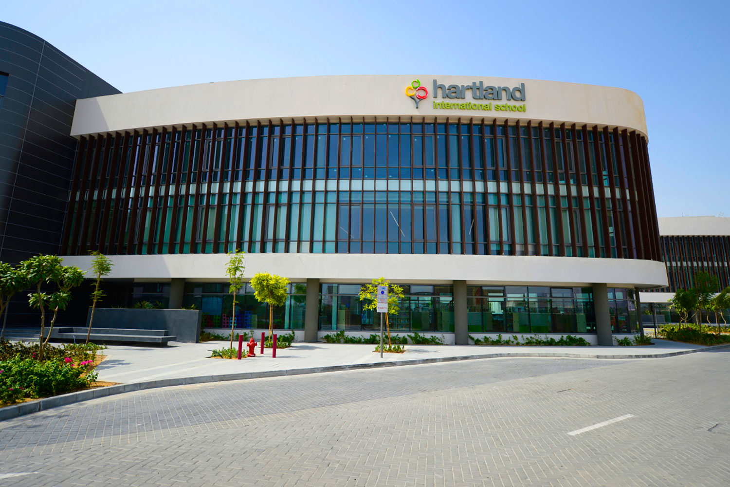 Purpose-built campus in Sobha Hartland, Mohammed Bin Rashid City, featuring modern glass-and-steel architecture arranged in grassed quadrangles across three floors. Three sections for Foundation, Primary, and Secondary with a 645-seat auditorium, 25-metre swimming pool with competition touch-pad technology, professional recording studio, and black box theatre. Major expansion in 2025-26 adding three covered sports halls, two padel courts, and a full-size football pitch.