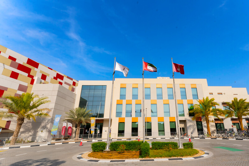 53,000 square metre purpose-built campus in Nad Al Sheba 2, Meydan South. L-shaped buildings with dedicated Nursery, EYFS, Junior School, and Senior School sections with large open spaces and shaded play areas. Features a 6-lane 25-metre swimming pool, 4G cricket/hockey/rugby pitches, 4 ITF-approved tennis courts, double-sized indoor sports hall, 460-seat theatre, 14 science laboratories, and Apple Mac music suites. Solar rooftop covering approximately 50% of electricity needs.