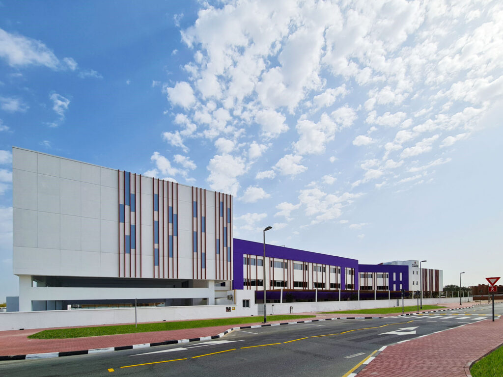 Purpose-built campus in Al Safa 1, Jumeirah, Dubai. Relocated in 2020 from the original site around the corner. Modern design with underground car park, classrooms with direct outdoor access for younger students, and cleverly utilised shared spaces.